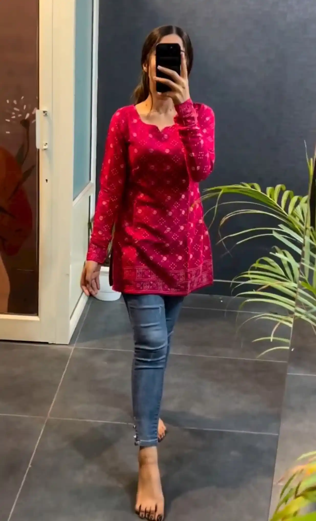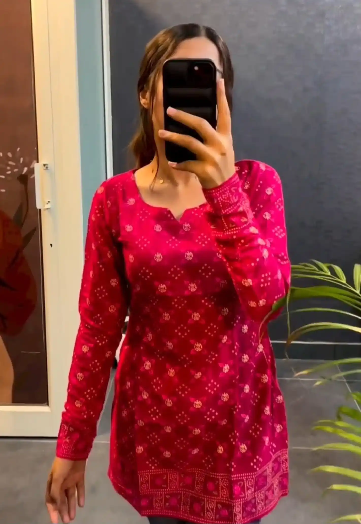 Samvrita Pink Bandhani Printed Rayon Cotton Full Sleeve Top