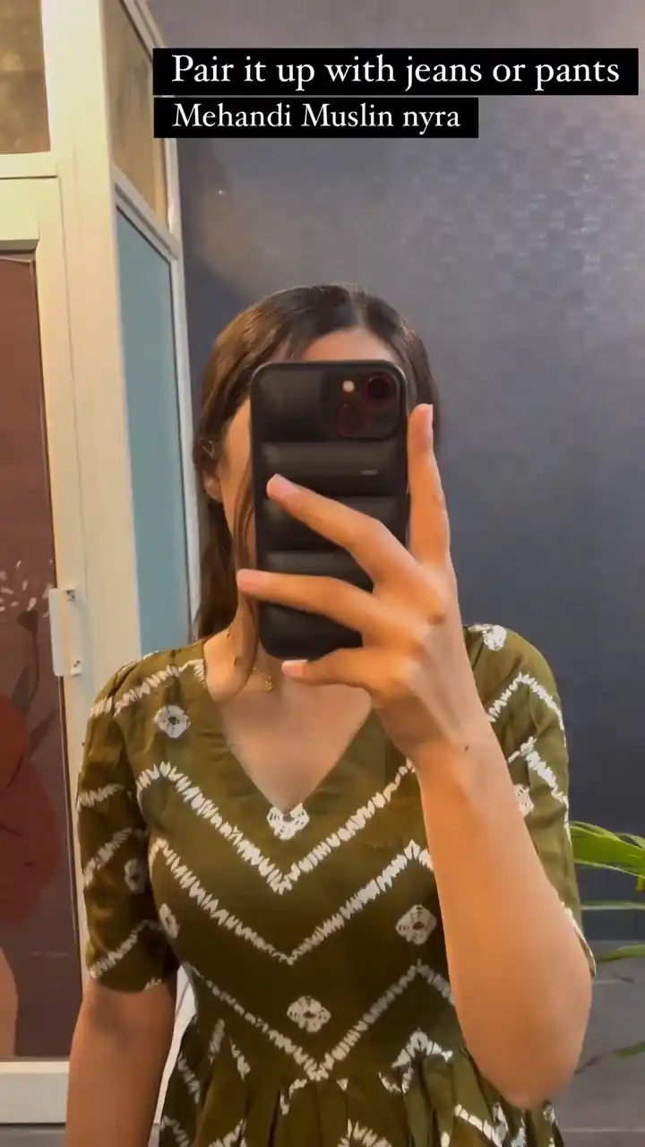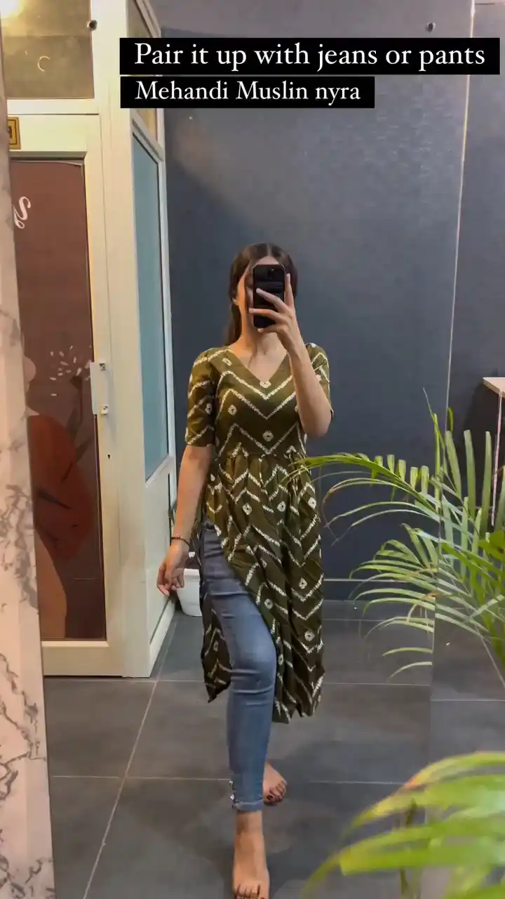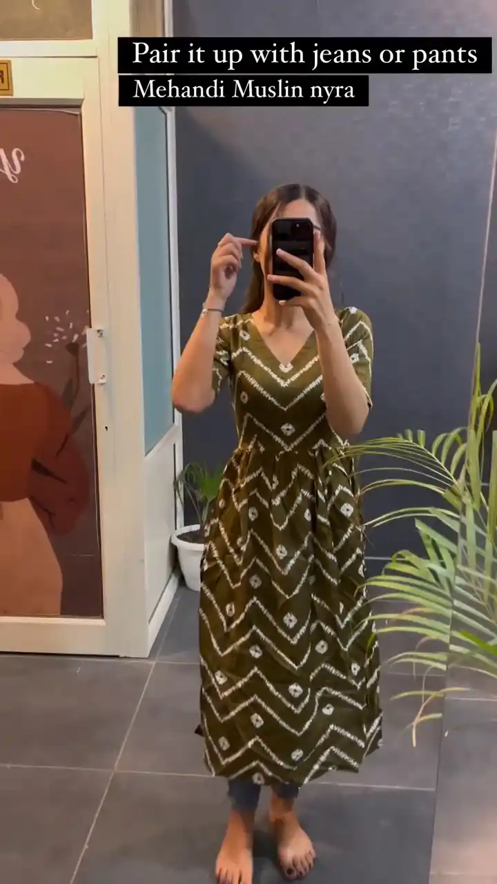 New Womens Mahendi Colour Printed Cotton Nyra Cut Kurti