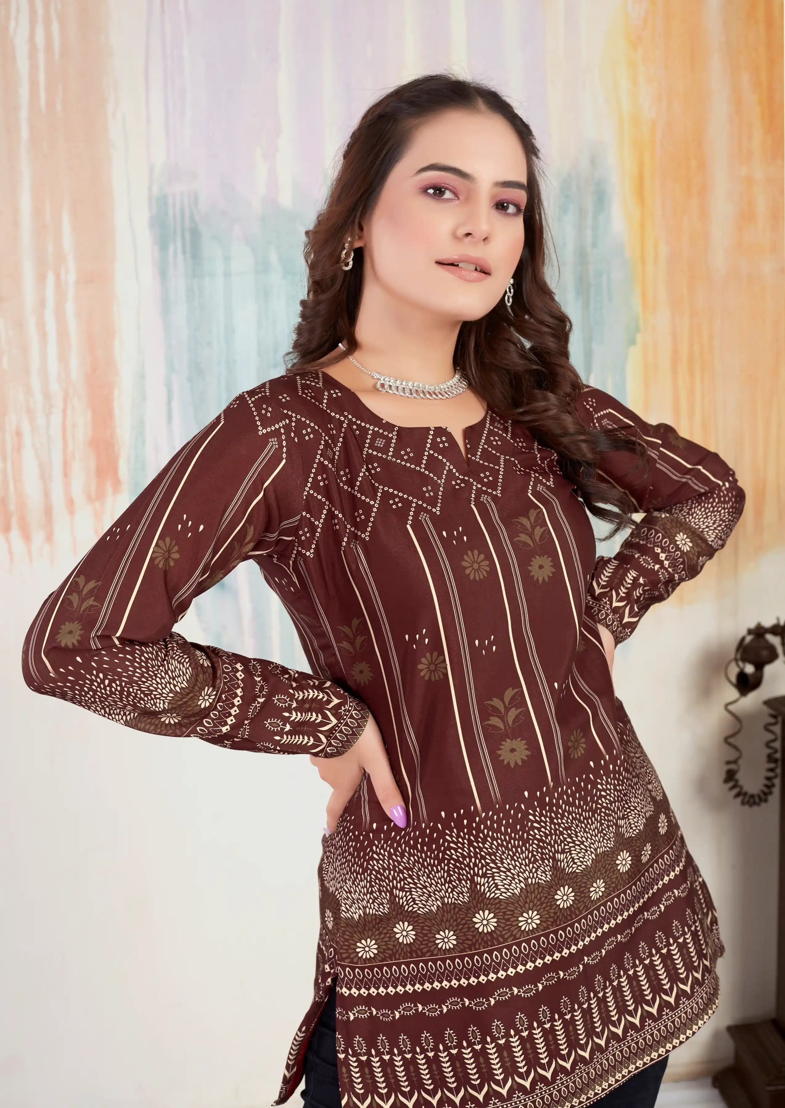 Brown Choko Moko Cotton Printed Short Kurti With Full Sleeves
